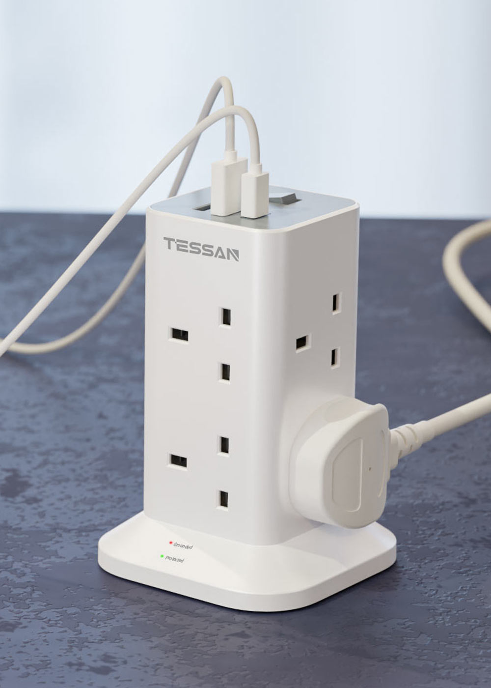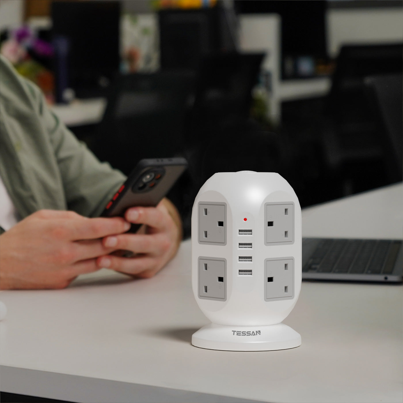 The purpose of vertical tower design for the extension lead is to help people has a better organized desktop, floor and etc. It will make your living spaces look much neater and having a good mood when you are using multiple electronic devices.