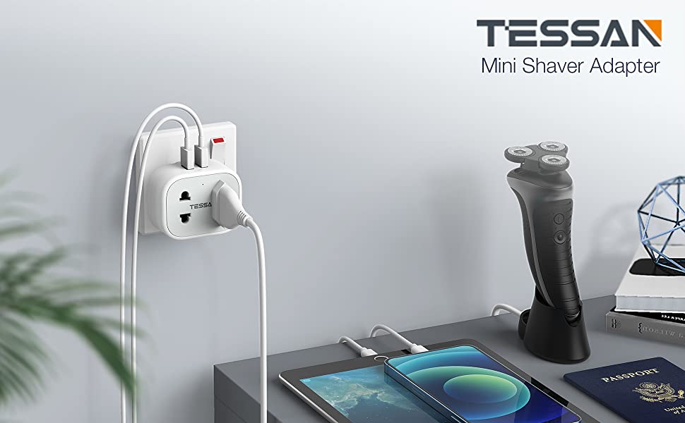 TESSAN 4 IN 1 Plug outlet accepts the standard UK 2 pin plug(shaver plug), European plug(Type C/E/F), and 2 pin US plug(Type A). You can use majority of two pin devices with it. This double 2 pin charger adapter allows you to charge a toothbrush, beard trimmer or other two-pin devices and 2 USB devices at the same time