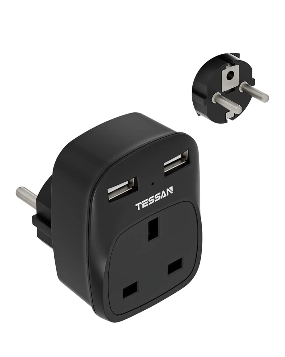 Black Schuko European Adapter with 2 USB Ports 3 in 1 Travel Adapter This EU plug adapter is used to connect devices with standard UK plugs and European sockets (type...